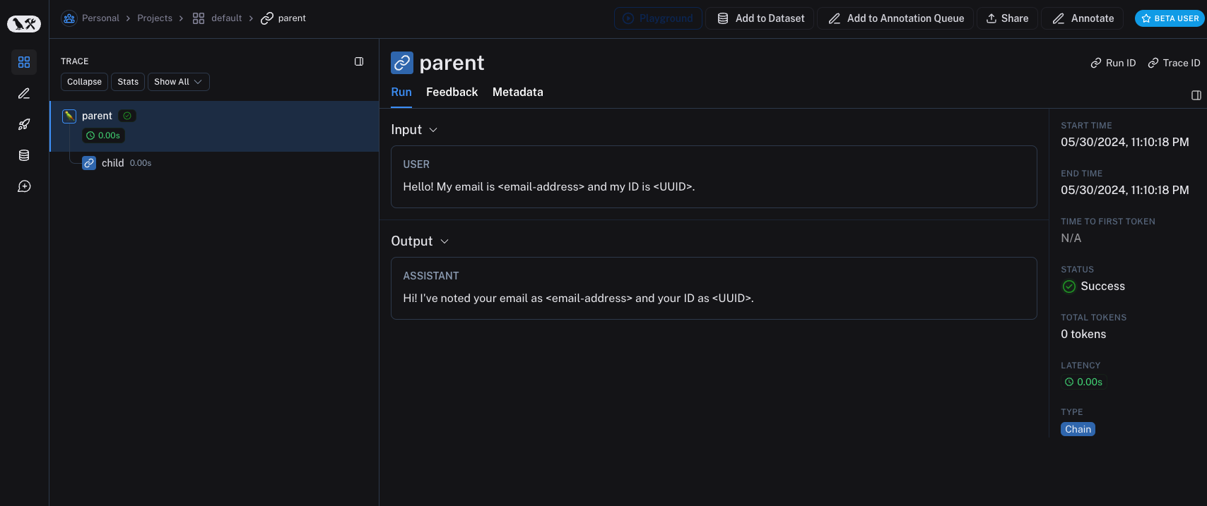 익명화된 실행은 LangSmith에서 다음과 같이 표시됩니다: