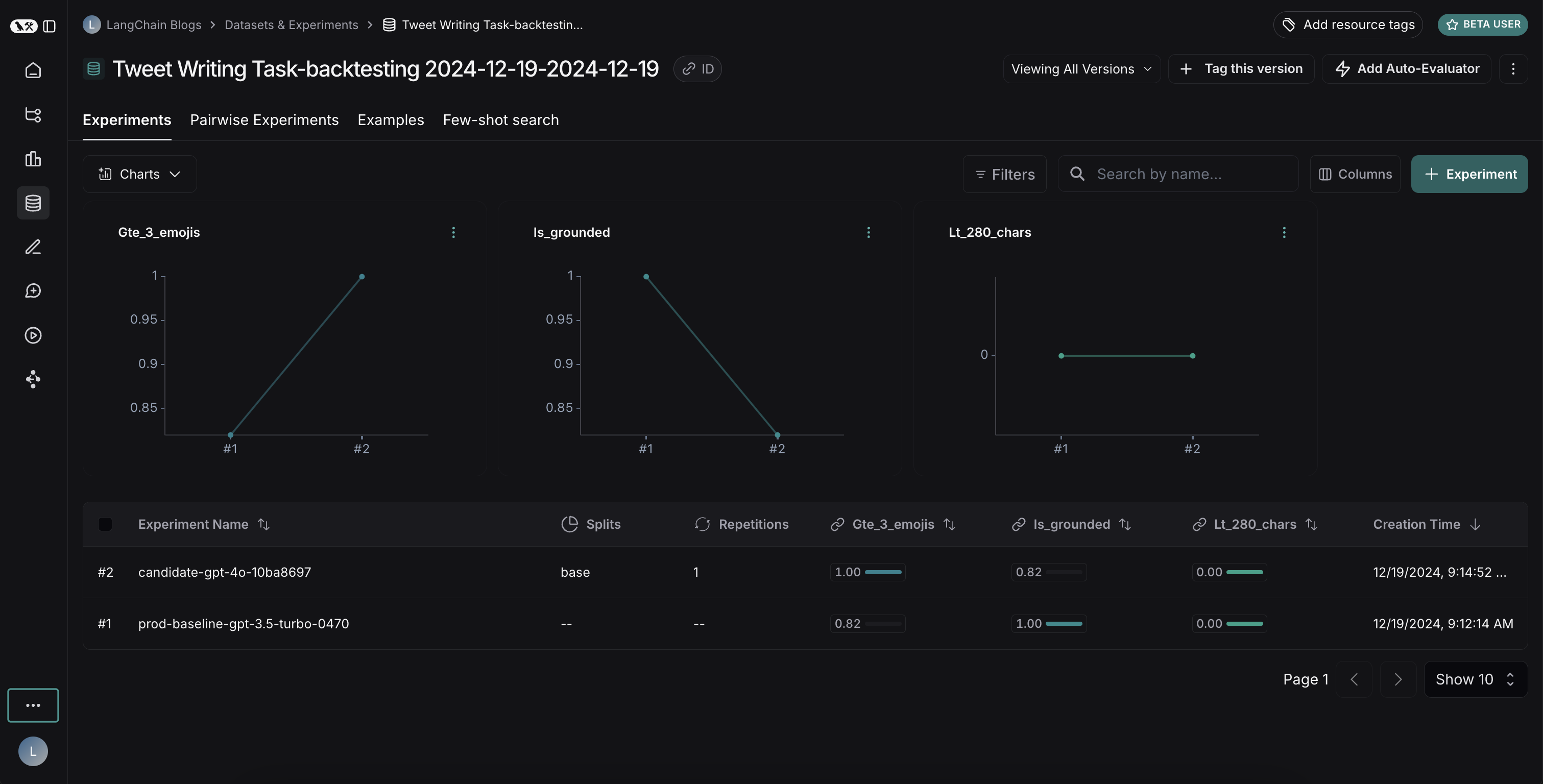 이 단계가 완료되면 LangSmith 프로젝트에 “Tweet Writing Task-backtesting 오늘 날짜”라는 새 데이터셋이 다음과 같이 단일 실험과 함께 표시됩니다: